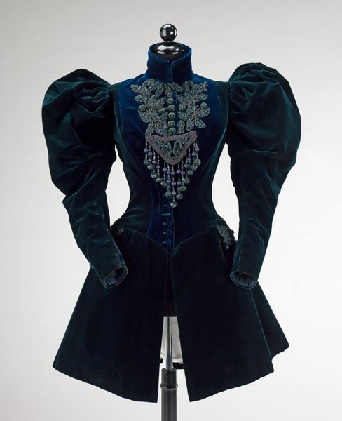 This is an afternoon jacket created by the House of Worth. Fashion is always a reflection of its historical moment. The House of Worth was a Parisian fashion house founded in 1858 and it is a prime example of how social class influenced sartorial choices. In the late 19th century, high society women followed strict dress codes and clothing was an indicator of one's social standing. The jacket's opulent velvet, elaborate embellishments, and overall design are a signifier of wealth, taste, and adherence to social conventions. The silhouette with its large sleeves and fitted waist embody the ideals of feminine beauty of the period. To further research this piece, one could explore fashion plates, etiquette manuals, and social commentaries of the time to gain insight into the cultural context surrounding it. By doing so, we can start to understand the social rituals and values embedded in this garment.