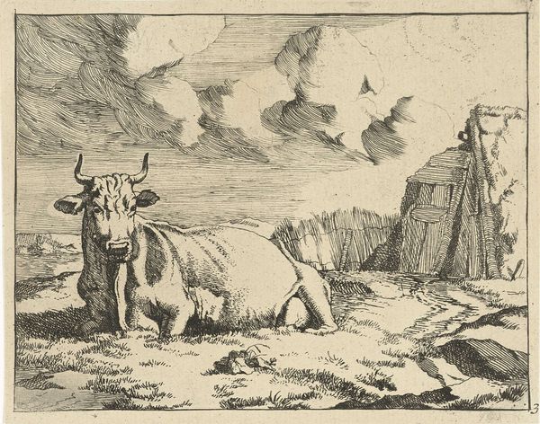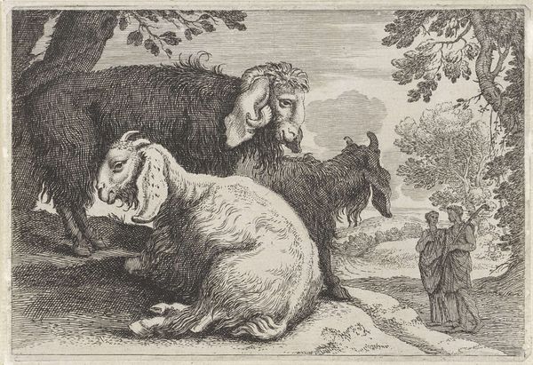 This engraving depicts a donkey, sheep, and a goat against a pastoral backdrop. The grouping of animals has long been a symbol of rural life, and each animal carries its own weight of historical association. Take, for instance, the figure of the donkey. Often seen as a beast of burden, it also appears in religious contexts, think of Christ's entry into Jerusalem. Here, the donkey stands laden, perhaps a symbol of patience and humility. The sheep, huddled together, evoke ideas of innocence, of the flock, of sacrifice—echoing images from the Bible and ancient pastoral poetry. Even the goat, with its caprine associations, brings to mind Pan, the pagan god of the wild, and the duality of nature. Note how these motifs evolve and resurface through history, reminding us that symbols carry cultural memory. They engage us on a subconscious level, stirring emotions and recalling ancestral echoes. It's a powerful force that binds us to the past in an ever-changing present.