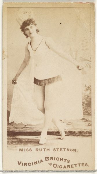 Editor: Here we have a trade card from the Actors and Actresses series, specifically featuring Lily Howard and produced for Old Judge Cigarettes between 1886 and 1890. I find the aged, sepia tone gives it such a vintage feel, almost like peering into a bygone era. What stands out to you when you look at it? Curator: Well, consider the context. These weren’t meant for museum walls; they were tucked into cigarette packs. This was the booming era of mass media and burgeoning consumer culture. How do you think this image participated in the culture of that time? Editor: Hmm, well I suppose these cards gave everyday people access to the likenesses of famous performers...a democratizing effect maybe? It made art more available. Curator: Exactly! Think about the politics of image production. Why an actress? Why this pose? These cards shaped public perceptions of celebrity and femininity, constructing idealized images for mass consumption. What does the reference to ‘orientalism’ bring to your mind, thinking about the historical implications? Editor: That's a great point! The way she is positioned and the overall exoticized style contributes to an understanding of ‘orientalism’ at the time. It hints at larger social implications. Curator: Precisely. These seemingly simple commercial images functioned within broader cultural systems, promoting not only cigarettes, but also specific ideas about beauty, fame, and even cultural appropriation. We see it now for what it really is. Editor: That has definitely given me a richer appreciation of trade cards! Thanks so much! Curator: My pleasure. It is important to see art's intended purpose through historical and cultural lenses.