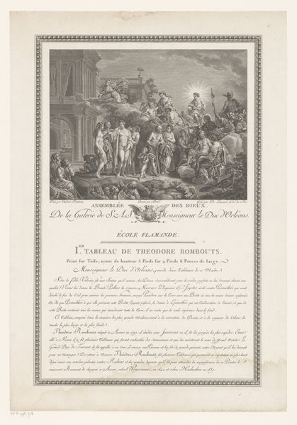 Editor: This is "Titelprent met theaterzaal en gesloten gordijnen," or Title Print with Theater and Closed Curtains, by François Joullain after Charles Coypel, an engraving from 1726. It's fascinating to see a theatrical setting rendered in such detail. The energy is palpable with all the eyes looking upwards! How would you interpret this image? Curator: The symbols here resonate deeply. A closed curtain in theatrical iconography often suggests a moment of anticipation, a pregnant pause before revelation. Look closer: angels frame what reads as a dedication to the public. Does it hint at a transition from private aristocratic patronage to a broader, more bourgeois audience, perhaps, and what are we to make of the dedication? Editor: So, it’s not just about the play, but the shifting cultural landscape? Curator: Precisely. The text presented on the curtain acts as its own performative space for declarations. The faces in the audience staring at the curtain invite questions about reception, about spectatorship. Consider, what did "going to the theatre" signify socially and culturally in 1726? The chandeliers suggest it may not all have been performance…what else took place here? Editor: It's almost as if the play itself is secondary to the social rituals surrounding it. I hadn’t thought about that. Curator: The cultural memory embedded within performance spaces makes this print resonate beyond a simple illustration, don’t you think? Editor: Absolutely. Looking at the audience *as* the spectacle—a powerful layer. Thank you for unveiling that!