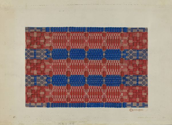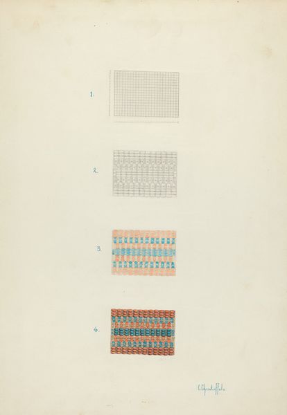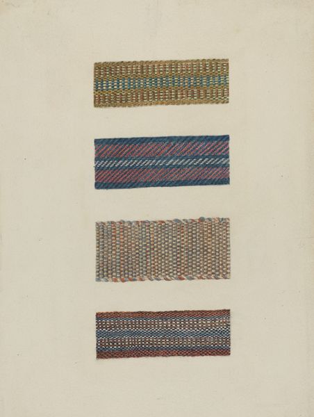Editor: Here we have “Fragments of Shaker Chair Braid,” created around 1938 by Orville A. Carroll, in a mix of drawing and textile mediums. It reminds me of samplers; so simple yet precise. What do you make of it? Curator: It's interesting you say that. How does the implied domesticity—of a chair, of woven fabric—strike you in light of the Shaker community’s values, which prized simplicity and function? This isn't just about the design itself, but the values embedded within it and how those values circulated and were perceived in the wider world. Editor: I hadn’t thought about that angle. The clean lines and color choices now seem like they’re telegraphing that specific philosophy, but could they be more widely interpreted, perhaps even be appropriated for other uses by another group of people who ascribe to similar minimalist tenets? Curator: Precisely! This design exists not in a vacuum, but within specific historical and cultural forces. Who was consuming these designs? How were they interpreted outside the Shaker community? And what can this textile study tell us about how the Arts and Crafts movement selectively reinterpreted and adopted various elements of this cultural ethos? Editor: So it's less about the chair itself and more about what that chair—and the braid that adorns it—represented in broader cultural conversations about labor, aesthetics, and spirituality at that moment in time? Curator: Exactly. Carroll's fragment isn't just documentation, it’s a reflection of the design's journey, and potentially a sign of its impact as a Shaker emblem for these values. The choices the artist made offer valuable perspectives into understanding these complex socio-political dynamics. Editor: I see. I was initially just drawn to the neatness, but you’ve shown me it connects to so much more than meets the eye! Curator: Indeed, by considering its historical and cultural contexts, it gives greater appreciation for textile like this one.