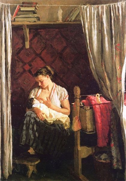 Editor: Here we have Kuzma Petrov-Vodkin's "Girl with a Doll" from 1937, an oil painting. I'm struck by the girl's direct gaze; there's a certain seriousness in her eyes. What do you see in this piece, beyond a simple portrait? Curator: It's precisely that gaze we need to unpack. Consider the year, 1937, in the Soviet Union. This was a period of immense social and political upheaval, Stalin's Great Purge. What does it mean to portray childhood during a time when innocence was so fragile, so easily corrupted or lost? Is this a straightforward representation of girlhood, or something more? Editor: I hadn’t considered the historical context so directly. You're suggesting the painting might be commenting on the anxieties of the era? Curator: Absolutely. Think about the doll itself. It's rather crudely made, its face somewhat worn. Does it represent the idealized vision of childhood often promoted by propaganda, or something more closely resembling the reality for many children at the time? How might this image be received by viewers accustomed to seeing idealized images of children as the future of the revolution? Editor: So, it’s a complex interplay between individual portraiture and broader social commentary, challenging the propaganda. It makes you wonder what the artist intended to communicate about identity. Curator: Exactly! By juxtaposing the girl’s solemn expression with the doll’s worn appearance, Petrov-Vodkin invites us to consider the weight of history on even the youngest generation. It disrupts the narrative. How do images of women and children function within propaganda? Editor: I’m starting to see how deeply political this seemingly simple portrait is. I was so focused on the subject. Thanks for widening my perspective! Curator: Art is rarely created in a vacuum; understanding its social and political contexts can unlock so much more than meets the eye. Examining representations of women and girls gives us clues to cultural values.