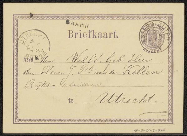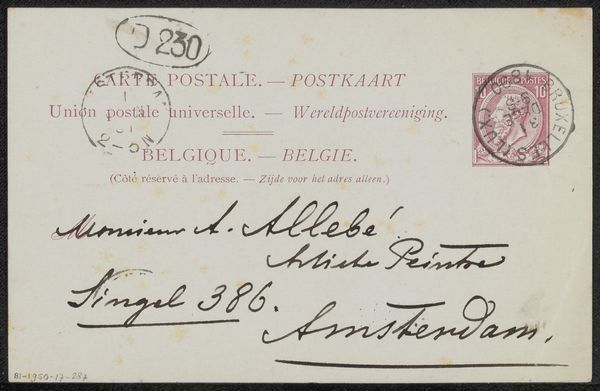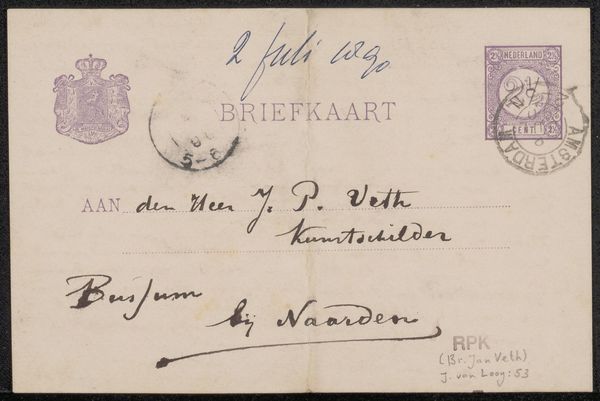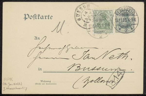 This is a postcard to Jan Veth, sent by the artist Wally Moes, and postmarked 1886 in Germany. The postcard, seemingly a mundane artifact, offers a window into the social networks of artists and intellectuals in late 19th-century Europe. At this time, postcards were a relatively new technology, facilitating quick and casual communication across distances. This particular card, sent from Germany to Holland, underscores the interconnectedness of the European art world. We might ask, what role did these networks play in shaping artistic reputations and movements? Did Veth and Moes correspond often? Were they part of a larger circle of artists, critics, and patrons who shaped the art scene of the time? By tracing the paths of such objects, and researching the lives and connections of individuals like Veth and Moes, we can begin to understand the social and institutional forces that shaped artistic production and reception in the late 19th century.