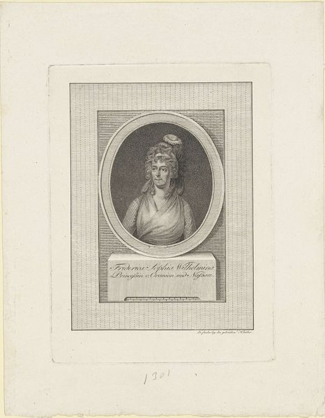 Curator: Ah, this portrait. The Rijksmuseum holds this engraving created between 1813 and 1815. It depicts Frederika Louisa Wilhelmina, Sovereign Princess of the Netherlands. Editor: Well, it's striking, isn't it? In its own reserved way. There's this immediate sense of... I don't know... slightly stifled dignity? She's beautiful, undeniably, but almost pinned in place by the formality. Curator: The choice of engraving definitely reflects a desire for widespread distribution. Think about it – prints allowed the image of the sovereign to be disseminated far beyond the court, into middle-class homes. She becomes a visible symbol, doesn't she? Editor: Exactly! And I find it almost humorous in a melancholy way that her finery tries to give her presence power, the composition makes the frame and background feel so utterly vacant, creating this interesting emptiness. Curator: Neoclassicism valued clarity and order. Here, Wilhelmina's status is communicated through these visual cues – the crown, her clothing, and, of course, the formality of the portrait itself, which all reflect a kind of cool control and carefully cultivated representation of power. Editor: Cool control indeed! What this portrait evokes in me is, the weight of expectations of society placed on an individual. You sense both the honor and constraint of it. Does that come across at all in your historian's gaze? Curator: Oh, absolutely! These images aren’t neutral, are they? They participate in constructing the very idea of leadership. By carefully crafting this image, Wilhelmina projects herself not just as a woman, but as a representation of the Netherlands, right as the nation itself was taking shape. It’s a loaded image. Editor: It makes me wonder about her. Not just the Princess of the Netherlands, but the person behind the engraving. It’s a gentle reminder that even in grand state portraits, humanity often flickers beneath the surface. Curator: Indeed, and studying it helps us appreciate the crucial relationship between political representation and personal expression, something crucial to understanding historical portraits. Editor: For sure. Thank you for unveiling some of the complexities lying in this old engraving.