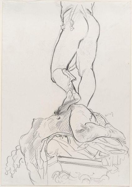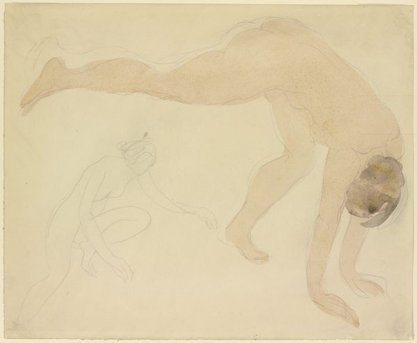 Curator: This is "Study of a Female Figure," currently residing at the Harvard Art Museums, rendered by an imitator of Auguste Rodin. It certainly bears his influence. Editor: Immediately, I see a figure suspended between vulnerability and strength, almost caught in a moment of transformation. The rawness is captivating. Curator: The drawing itself, from what we can observe of the paper, and the thin watercolor washes, appear to be a study for a larger work, maybe in clay. The line work shows a clear material understanding of the body's form. Editor: The pose is fascinating when you consider societal expectations of women. Is this an unveiling, a struggle, or a liberation? Curator: Perhaps all three, viewed through the lens of the artist's labor in mimicking Rodin, a master of sculpting and drawing the human form. Editor: It's interesting to ponder the many layers of influence and the figure's agency within them. Curator: Indeed, the materials and mimicry tell a rich story about artistic production. Editor: And the body continues to provoke thought long after its creation.