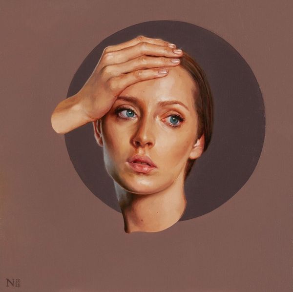 Curator: Aaron Nagel’s painting, “Darling II,” created in 2021, presents us with a striking contemporary portrait. What strikes you first? Editor: It’s the interplay of stark geometric shapes with the softness of the flesh tones. The darkness almost consumes her, yet she has this luminous quality. It's a peculiar effect achieved through a precise layering of, presumably, oil paint. Curator: The geometry creates a sense of isolation, doesn't it? It almost feels like the figure is emerging from some sort of void. I'm interested in Nagel's choice to depict the female figure this way, in the tradition of the Old Masters but within a very modern, almost stark, setting. How do you think the artist approaches material in this kind of work? Editor: The smooth application of the oils—likely many glazes—suggests a real control over the medium. Nagel isn't just slapping paint on; he's coaxing light from the surface through meticulous build-up. We need to consider the labour involved here, a focused, repetitive act leading to this precise image. There's craft involved. Curator: I see the control and how he balances historical painterly techniques with contemporary modes of figuration, but I think the real success of this work lies in the haunting ambiguity he establishes. The subject's gaze, her slight upward tilt of the chin… What stories are embedded within a gaze, and what stories are embedded within art history when approaching such work? Editor: Perhaps a story of vulnerability rendered with skilled labor? Curator: Indeed. “Darling II” gives us a new narrative about the representation of the human form and beauty. Editor: A thoughtful application of oil can be deceivingly compelling, can't it?