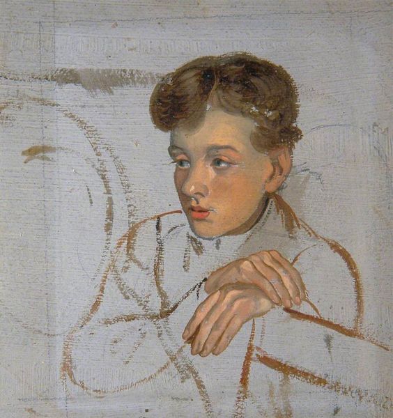 Friedrich von Amerling rendered this study of a boy's head with oil on canvas. The portrait is structured by contrasting lights and darks that carve out the boy's features, giving him a sculptural presence. Notice how Amerling uses visible brushstrokes to model form. The application of paint is economical, yet the artist captures a vivid sense of youthful softness, especially in the cheeks and the boy’s direct gaze. The composition is tightly cropped, focusing our attention on the face, which is turned slightly upward and away, creating a sense of both vulnerability and defiance. The formal qualities of this study—the contrast of light and shadow, the textured brushwork—go beyond mere representation. It delves into a semiotic interplay, where the surface of the canvas becomes a signifier of artistic process and human presence. Through this method, Amerling elevates the study to a contemplation on the nature of portraiture itself.
