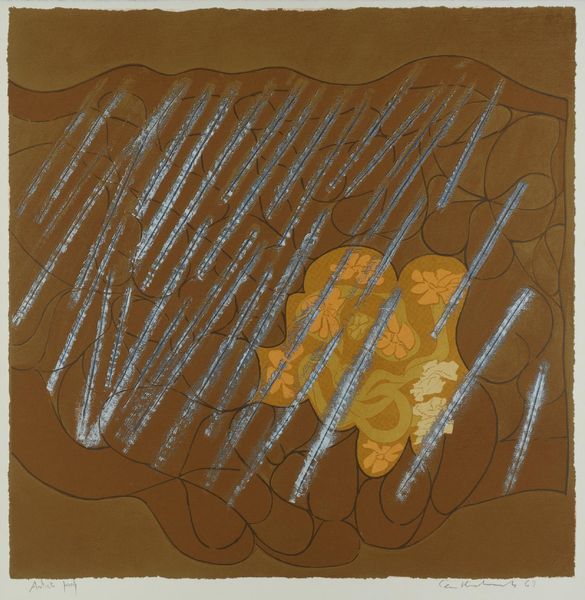 Curator: This work, by Patrick Heron, is an undated piece held in the Tate Collections, measuring roughly 67 by 80 centimeters. Editor: It strikes me as joyful and somewhat chaotic, like a field of golden wildflowers seen through a heat haze, don't you think? Curator: Heron's trajectory moved towards pure abstraction. We can consider this piece as part of a broader exploration of color and form, influenced perhaps by his contemporaries and the socio-political shift towards more expressive art forms. Editor: Absolutely. Thinking about post-war artistic liberation, could we see this as an expression of breaking free from formal constraints? The splashes feel almost defiant. Curator: It’s possible. His works often challenged traditional notions of representation, reflecting evolving cultural values of that time. Editor: It’s a piece that invites us to consider the intersections of artistic freedom, social change, and personal expression. Curator: Indeed, this work reminds me about the transformative potential of art when the artist is liberated from tradition.