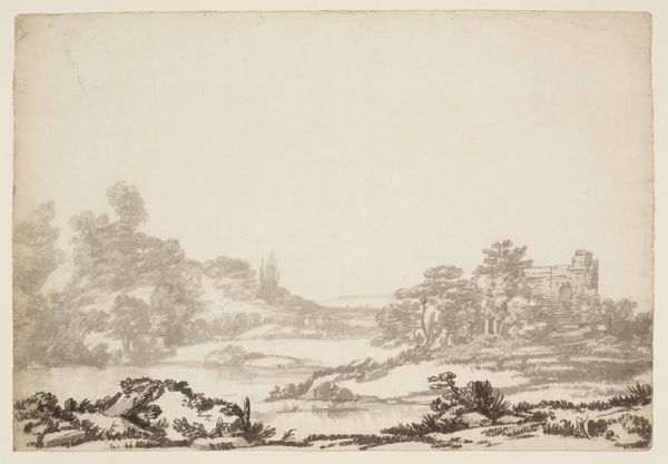 Editor: Here we have “Man bij een waterval,” or “Man at a waterfall,” an etching by Reinierus Albertus Ludovicus baron van Isendoorn à Blois, dating from around 1834 to 1835. There’s such a delicate, quiet feeling to it, even with the waterfall… almost like a faded memory. What captures your imagination in this piece? Curator: Faded memory is spot on! For me, it’s the interplay between the solitary figure and the landscape. He’s quite small, isn't he, almost swallowed by the grandeur of nature? Do you think he looks like a sightseer to you, or does he represent something more, perhaps humanity's fleeting presence amidst the eternal flow of nature? Editor: That’s a wonderful point! I hadn’t considered the contrast between the man and the landscape representing humanity's fleeting presence. I was so caught up in the tranquility! I was thinking it may represent the ideal flâneur from the period, strolling through the environment, and using nature as an escape. Curator: Precisely! The *flâneur*, the wanderer... I think you are on to something there. There’s a quiet dignity in his posture, wouldn’t you agree? It's so indicative of the Romantic era, this appreciation, even awe, of nature's power. Now, look at the technique. Notice the detailed lines to convey a sense of movement, particularly in the water? Editor: Yes, the water feels almost…alive. It’s interesting to think that it uses realism, with elements of Romanticism sprinkled in! Curator: It certainly does! Funny how we tend to put things into boxes, isn’t it? As you study more and more art, you'll come to appreciate how most of it escapes easy definition. Every time you look at the art, just like the waters in the waterfall, things continue to shift, and that makes the pursuit of art that much more beautiful, and that much more intriguing, no? Editor: Absolutely! It makes you think… makes you feel… almost like taking a little hike, you know? Thanks so much!