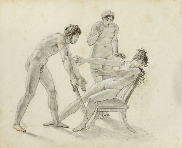 Editor: This is Arend Alans’ “Zittend mannelijk naakt, van opzij gezien,” or “Seated Male Nude, Seen from the Side,” likely from 1789. It's a pencil drawing and feels so grounded and weighty, in part due to the subject’s pose, the angle of his head, and the presence of that architectural element. How do you interpret this work, especially given the time it was created? Curator: This drawing speaks volumes about the academic structures in place at the time. Note the inscription “3e prijs 1789,” meaning "3rd prize, 1789." It exemplifies the values of academic art—precision, idealized form, and a clear mastery of anatomy, elements often tied to a privileged, patriarchal view. But consider this: who was afforded the opportunity to study the male nude, and who was excluded? Editor: That's a great point. It's easy to see the classical influence and admire the technique, but I hadn’t immediately considered the socio-political dimensions of accessing and depicting the nude figure. Curator: Precisely! The male nude in art has a long and complex history, frequently used to convey power, beauty, and heroism, concepts laden with societal biases. We should examine the context: was this a progressive stance embracing naturalism, or simply reinforcing existing power dynamics? Who was Alans, and what was his position relative to these structures? What narrative might a female artist of the same period have produced? Editor: So, it's important to look beyond the surface and consider whose perspectives are amplified and whose are suppressed. That makes the act of observing the artwork itself a critical one, right? Curator: Absolutely. By interrogating these historical biases, we can gain a more nuanced and critical understanding of both the artwork and the society that produced it. I am drawn to consider its contemporary echoes: How do current social inequalities and power imbalances influence artistic creation and appreciation today? Editor: This has really opened my eyes. I’ll never look at another classical nude without considering the larger social and historical context. Curator: Wonderful! I learned something myself through this conversation. Let's continue thinking about who holds the power to create, depict, and interpret art throughout history.