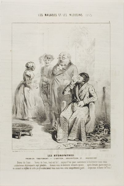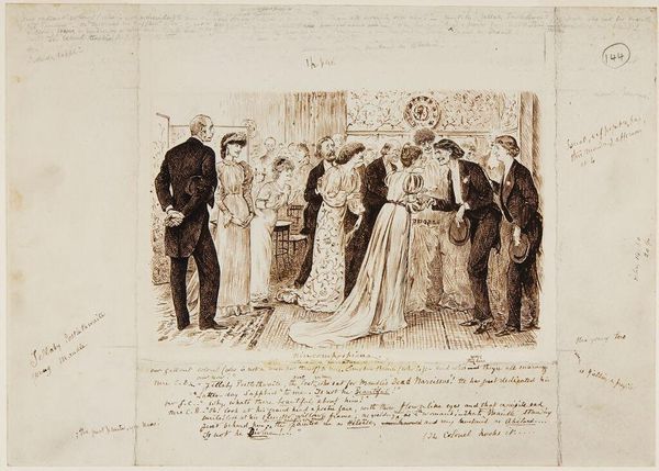 Curator: This drawing, "Nil desperandum!" by George Louis du Maurier, presents a fascinating scene of social interaction. It's rendered with delicate linework, creating a sense of refined elegance. Editor: It strikes me as a commentary on class and gender roles, almost theatrical in its staging. The woman in the center appears to be a focal point, surrounded by attentive men while other women are relegated to the periphery. Curator: Absolutely. Du Maurier often satirized Victorian society. This piece can be read through the lens of feminist theory, examining the constraints placed upon women and the power dynamics at play within these social circles. Editor: And the artist’s use of line is so strategic! The density of hatching creates a visual hierarchy, emphasizing certain figures and details, guiding our eye through the scene. Curator: I agree; it reveals how identity is constructed and performed within a specific historical context. Du Maurier invites us to question the underlying assumptions of his time. Editor: The composition, with its careful arrangement of figures, creates a tableau vivant—a living picture—that captures a moment of Victorian life. Curator: A moment pregnant with unspoken narratives and social critique. Editor: Precisely. A testament to the power of visual language.