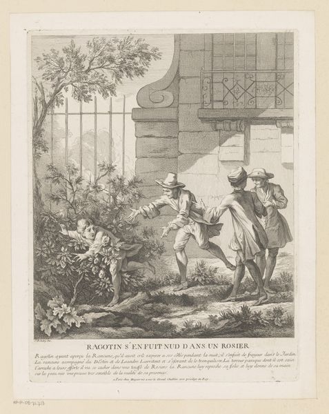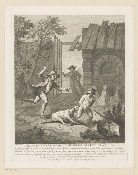 Editor: This engraving, "Arrival of the Operator in the Inn," is attributed to Gabriel Huquier, created sometime between 1705 and 1772. There's such a busy, almost chaotic energy to the composition – a whole entourage arriving at this inn. What stands out to you? Curator: The "operator," or perhaps more aptly translated, "performer," as the inscription implies, embodies the transience and theatricality of 18th-century life. See how he's mounted on the horse, his servants surrounding him, even a monkey perched on his shoulder? It is a procession of symbolic performance. Editor: So, it’s not just a literal depiction of a journey but a symbolic one? What does the monkey represent? Curator: Consider the figure of the monkey, often a symbol of imitation or trickery. Its presence suggests the "operator’s" craft relies on artifice, a temporary escape from reality. These images weren’t just decorative; they reflected the viewer’s social aspirations and understanding of the world. The building is rather generic as well. Does that have any significance for you? Editor: It adds to the transient feeling. Like this could be *any* inn, *any* place to escape and be entertained. So the figures, especially the monkey, carry deeper meaning than what first meets the eye? Curator: Exactly! It speaks to how popular entertainers carried both prestige and suspicion at the time. Think of the theater; always on the move. It prompts us to consider the layers of representation. What appears spontaneous is likely carefully constructed for the audience – a mirror reflecting the desires and anxieties of its time. Editor: That really shifts my perspective. It's more than just a scene; it’s a comment on society and the performative nature of everyday life. Curator: Precisely. Images held incredible weight then; the arrival itself is a carefully staged announcement of intent. Consider, what ‘performance’ are you announcing with *your* arrival somewhere?