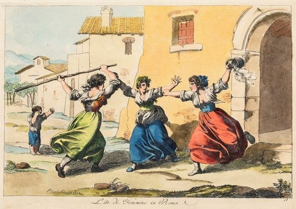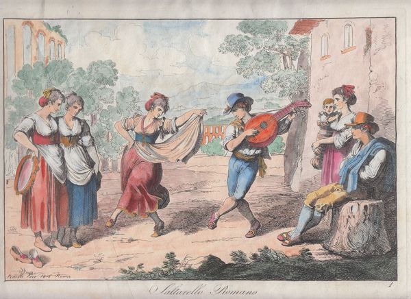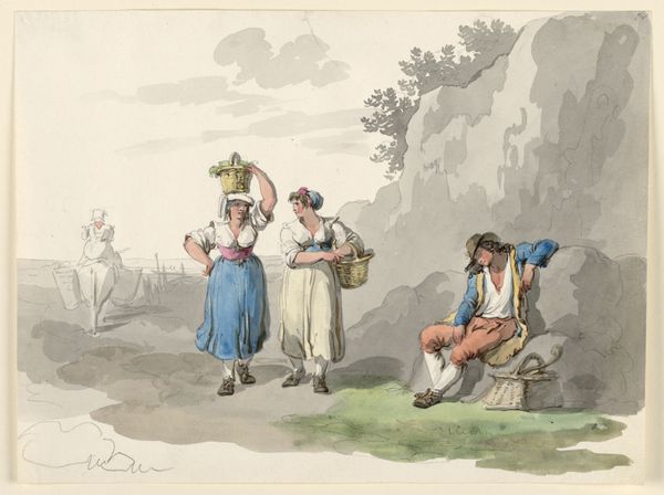 Curator: Bartolomeo Pinelli’s 1808 watercolor, “Return from the Vintage,” is currently held at the Cooper Hewitt. A joyous scene! What are your first thoughts? Editor: Energetic. The figures seem to leap off the page. There's a rhythmic quality achieved through the repetition of bent limbs and swirling fabrics. The color palette is restrained, predominantly whites and muted earth tones, yet the dynamism is undeniable. Curator: Indeed. Pinelli's attention to detail, especially in the costumes, tells a rich story of the workers, the clothing reflecting rural tradition and festival attire all at once. Note the ribbons and hats that seem to proclaim some allegiance. Editor: It’s the careful articulation of light and shadow which creates volume and conveys movement, the layering that adds depth and allows my eye to dance with these figures! Even though muted, there’s a clear definition which articulates mood here. Curator: The vintage or grape harvest held immense cultural weight in Italian society. As it still does for that matter. A communal endeavor, steeped in tradition, celebrating both the land's bounty and social ties. The figures embody more than just individuals. The grapes themselves can become almost mythical with links to wine, blood and even death. Editor: Absolutely. The very composition leads the viewer's eye across the plane from left to right. It's an invitation to participate in their revelry. The lack of a hard horizon further emphasizes the open air, enhancing that communal aspect, and I agree, it does emphasize joy through this very rhythm of form! Curator: Notice the lone child. Holding sticks aloft, a form of primal festivity is celebrated beyond socialized adult forms. In many cultures, trees represent ancient wisdom. Are these hints to the deep well of cultural practice available here? Editor: A very provocative thought! And there's such a beautiful tension. The romanticism is subdued but noticeable here in Pinelli's hand and composition. Thank you! Curator: Indeed. It speaks volumes about how carefully constructed even a seemingly casual scene can be when charged with symbols and cultural meaning.