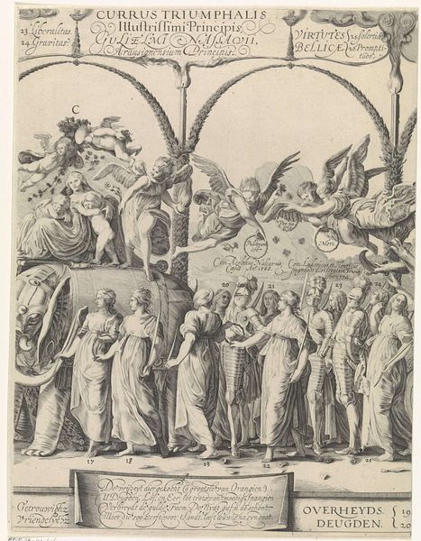 Curator: At first glance, this monochromatic print evokes a sense of serene procession and almost archaic allegory. Editor: Let's delve into this intriguing artwork, "The Triumph of Chastity." It's an anonymous piece, rendered in ink on paper, and currently residing in the Harvard Art Museums. Curator: The composition is striking. Notice the stark contrast between the static figure atop the pedestal and the flowing lines of the figures below. The artist's use of line and form creates a visual hierarchy. Editor: Absolutely. The print reflects a societal obsession with virtue, especially female virtue, in its historical context. The procession becomes a visual metaphor for the idealization of chastity as a public value. Curator: Indeed. The figures appear almost ethereal, their drapery acting as a kind of visual rhythm throughout the composition. Editor: Ultimately, both the aesthetic qualities and cultural values represented in this print make it a compelling study. Curator: I agree. Analyzing form and context reveals fascinating insights.