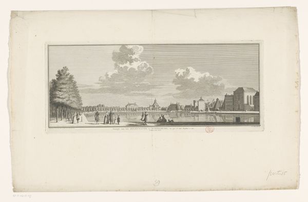 Curator: This delicate etching is Jan Caspar Philips's "Gezicht op Gouda," dating back to around 1743-1744. It resides here at the Rijksmuseum, offering us a window into the Dutch Golden Age through a city portrait. Editor: My first impression is serenity. The light, airy rendering almost softens the urban landscape. Even the details—the tiny figures in boats, the windmill—contribute to this pervasive tranquility. Curator: It is interesting to view such detailed urban imagery through the lens of the Dutch Golden Age. Prints like these were crucial in disseminating knowledge about cities, playing a vital role in constructing a shared civic identity. The image emphasizes the importance of trade. Editor: Absolutely. The windmill, aside from its functional role, has become almost a symbol of Dutch perseverance, hasn’t it? And water… water symbolizes the flow of goods, people, and ideas through a community. Curator: The print captures Gouda, but on a symbolic level, it speaks to broader ideals about urban life in the Netherlands and its place on the world stage. Notice how ordered the landscape is; Philips shows that urbanism could stand against what others perceived to be rural nothingness. Editor: Yet within this ordered composition, there are these incredible small elements, little ships with human cargo. I think that suggests something vital. Symbols for every single citizen being integrated into the identity of Gouda and of the country. Curator: These types of prints can teach us about what daily life would have been like for both the very wealthy and the much more numerous working class during this period. We see examples of this life through Philips' careful composition, where social roles were not merely incidental, but a cornerstone of this specific style. Editor: Considering this interplay—how symbols of civic pride are merged with the representation of the common citizens who embody them—gives us so much food for thought on our understanding of national pride. Curator: It reminds us that art is seldom isolated from society. Rather, it plays a significant role in how cities perceive their roles in the country's successes. Editor: Precisely. Contemplating how historical cityscapes such as this affect our modern perception offers intriguing insights.