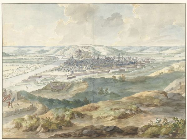 Curator: Looking at this watercolour by David Roberts, executed in 1847, titled “Jerusalem from the Mount of Olives," I am struck by the depiction of the holy city not as a static, monumental space, but as an environment embedded in layers of socio-political meaning. Editor: I'm immediately drawn to the subdued palette. It’s predominantly beige and grey, lending a certain melancholy and sense of vastness to the cityscape that sits in the distance. The rendering feels dreamlike and somewhat detached. Curator: Precisely, the 'detached' perspective contributes to a specific visual trope popular at the time. Roberts' view presents the Orient as both accessible and fundamentally distant, fueling a complex narrative about colonialism and representation. Editor: Yes, I see that the artist has arranged the scene with several figures in the foreground. This creates depth, yes, but more importantly, these characters anchor our view, inviting the viewer into the expansive landscape, almost staging it. Note the contrast between the dark crevices in the cliffs with the city washed with light further away. Curator: Exactly, he presents the East as knowable. It served the demands of European audiences eager for glimpses of biblical lands, but also solidified the West’s dominant gaze and the visual power it exerted. Editor: Visually, the watercolor technique enhances the sense of atmosphere. The subtle washes allow for soft transitions, which reinforces this idea of spatial distance that is echoed in its historical context, creating an interesting juxtaposition of the visible with that which cannot be reached. Curator: True, but remember Roberts himself was working within an established network of patrons and institutions, shaping not only how Jerusalem was seen, but how it would then be understood and consumed by the Western public through similar Orientalist depictions in painting, literature, and photography. Editor: It's been helpful to break this piece down today and note the use of perspective, palette, and the very careful layering of washes. It allowed us to understand some of its original power in the viewing process, however controversial. Curator: It is key to recognize that art not only reflects reality but actively creates it; "Jerusalem from the Mount of Olives" showcases this power dynamic in its purest form.