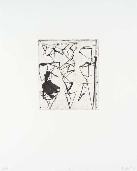 Editor: This is "15" by Brice Marden, printed sometime after his birth in 1938. It’s a small etching, mostly black ink on white. It feels almost like a Rorschach test. What story can we tell about this seemingly spontaneous composition? Curator: Well, considering Marden's broader body of work, often associated with minimalist tendencies, this print invites us to consider the role of chance and gesture within supposedly rigorous artistic frameworks. How might its display context—a museum, a private collection—affect its interpretation? Editor: That's interesting. So, the setting changes how we perceive its inherent spontaneity? Curator: Precisely! A gallery legitimizes it, elevates it. If we found it crumpled on the street, our reaction would be entirely different, wouldn't it? It prompts us to question the systems that ascribe value. Editor: I never thought about it that way. It's all so contextual. Curator: Indeed. That’s how the art world operates.