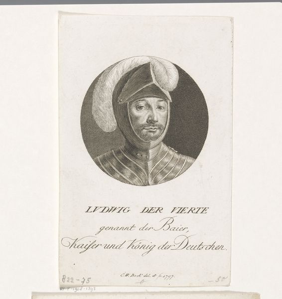 Curator: This is Christian Schule's 1816 engraving, "Graf von Neyperg." What's your immediate impression? Editor: The striking contrast of the stark, oval portrait against the paper’s aged texture is initially arresting. But his eye patch lends an immediate aura of mystery and martial intensity. What stands out to you from a formal perspective? Curator: It's all about the sharp lines and delicate stippling technique Schule employs. Look closely, and you see how he creates depth, not with broad strokes, but with meticulous precision, building tone on tone. There’s a remarkable sense of three-dimensionality despite the limitations of the print medium. Editor: True, and one must appreciate that each line, each dot, required significant skill and time. As a print, this was made to be distributed widely. Its material existence speaks to the rise of printed imagery and the democratization of portraiture in the early 19th century. I also appreciate the inscription beneath the image itself, it reads in German “Graf von Neyperg, K. K. Feldmarschallieutenant, Seine Divisions Commandant.” Curator: Indeed, which immediately frames it as a piece about nobility and rank, and helps clarify Neyperg’s role in the historical narratives that romanticism was fascinated with at this moment. Consider the composition – the framing of the face and the intense gaze which reflects perhaps ideas of duty, courage and a specific kind of honor that comes with the militarism in this historic moment. Editor: The engraving also invites us to ponder Neyperg's social position. What would this portrait have signified to its intended audience? And who were they, specifically? Was it primarily other members of the military, aristocrats who had enough purchasing power or some other specific demographic? It's a material object with the potential to open discussions of history and the commodification of power and status. Curator: Absolutely, and Schule brilliantly uses the language of academic art to subtly communicate these ideologies about Neyperg himself, class and nationalism in his historical moment. The composition directs the eye so precisely – every element has been clearly thought through. Editor: And thinking through the act of its creation, from the initial drawing to the final print—there’s a remarkable story embedded in those layered processes, the decisions, even the waste generated to come to the finished project that offers a fuller, much richer account of early 19th-century cultural landscape and artistic labor practices. Curator: Ultimately, Schule's "Graf von Neyperg" presents a compelling study in form, representation, and early 19th century societal mores. Editor: And as such, it highlights both the artistry involved in printmaking as well as the broader societal forces which are embedded within this image through material and design.