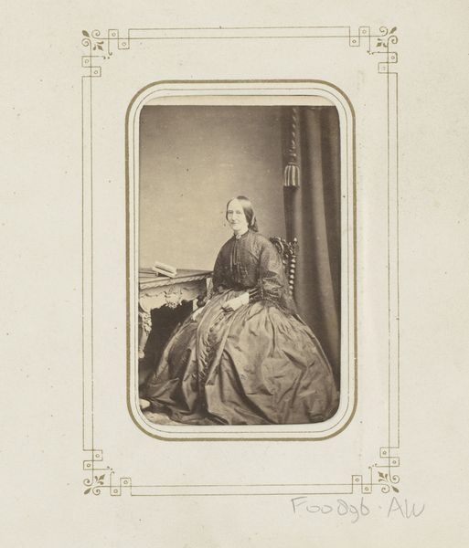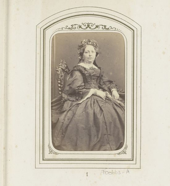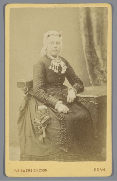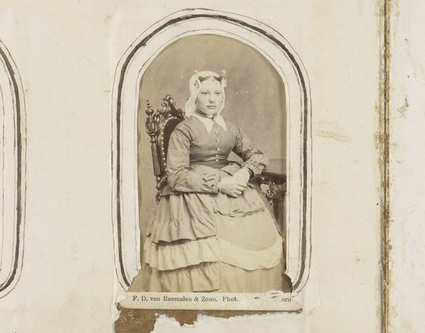Curator: This is a photograph by Huijsen & Zoon, titled “Portret van een zittend meisje met witte klederdrachtmuts en oorijzers,” created sometime between 1873 and 1883. Editor: Wow, a young woman frozen in sepia tones. I immediately sense a quiet dignity, but maybe a touch of melancholy? It’s a bit like staring into someone's faded dream. Curator: The composition is quite formal. Notice the sitter's central placement within the oval frame. The use of light and shadow accentuates the textures of her clothing and the intricate details of her traditional garments. Editor: That headdress and those "oorijzers"—ear irons? There's a rigidity there, literally and figuratively. I wonder about the weight, both physically and metaphorically, of such a culturally specific and prescriptive form. What stories are hidden beneath that white bonnet? Curator: Precisely. This portrait is rife with codes. The girl's attire speaks to a particular time and place. Her pose, almost austere, adds another layer of meaning. The realism attempts to capture a certain truth. Editor: The almost blurry texture also lends to the mystery and dreamlike quality. What’s so striking is that despite the seeming restrictions of her cultural garb, there's something luminous in her expression. It's like, she’s in the photo but slightly outside it. I can almost imagine her winking at me across time! Curator: The technical limitations of photography at the time undoubtedly influenced the style and the sitter’s stillness. We can analyze the contrast between sharp details and softer areas to explore that. Editor: And despite the rigidity in style, the details, her almost sad yet peaceful gaze and even the fact that this sepia tinted photo is here today means that she broke free! In the photograph, she may be in the past, but she can now exist freely in the future through art. Curator: True, this interplay between representation and something ungraspable creates an ongoing conversation. The artwork’s lasting impact prompts one to really pause and ponder. Editor: Agreed, to think of the lives, like hers, behind old photos gives us cause to truly connect through art with times beyond our own, which gives me hope for futures, even sepia tinted, beyond my own.