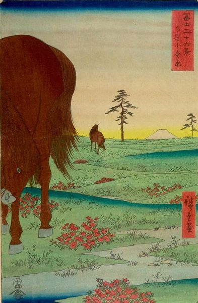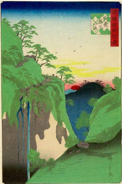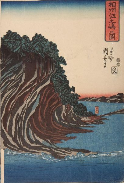 Editor: So, this is "Enoshima in Sagami Province" by Utagawa Kuniyoshi. It looks like a woodblock print. I'm really struck by how many tiny figures are scrambling all over the landscape. How do you interpret this work? Curator: Considering Kuniyoshi's process, the woodblock technique itself is integral. Each color demands a separate block, highlighting a complex division of labor. How does the mass production of prints for popular consumption affect its status as 'art'? Editor: That's a good question. So, it being a popular print, made in multiples, makes it less…precious? Curator: Precisely. And how might the availability of such imagery influence perceptions of landscape and travel for the average person? Editor: I never considered that. It’s like early tourism marketing, shaping desires through readily available, mass-produced images. Curator: Exactly. Thinking about the materials and the method of production really opens up what the work can mean.