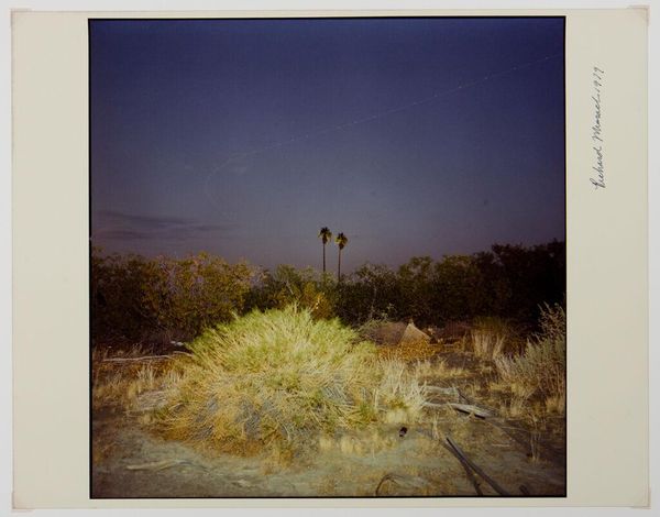Curator: Before us is Richard Misrach's "Night Desert" from 1977, a photograph that captures the enigmatic stillness of the desert landscape at night. Editor: My first thought is it’s oddly comforting. The monochrome palette softens the harsh desert environment, almost romanticizes it. Is that just me? Curator: Not at all. Misrach was deeply interested in how we perceive and interact with these seemingly barren environments. The choice of photography itself—a medium initially valued for its objective realism—was being radically questioned at the time. Editor: You can almost feel the stillness just looking at it, despite the evidence of activity… those mysterious light trails in the sky? That has to be a long exposure, I’d imagine, drawing the viewer in. Curator: Precisely. He explores human impact on the landscape but without being didactic. It invites us to contemplate the scale of time, ecological concerns, and the desert as a site loaded with political history in the American West. Editor: Right, I read Misrach wanted to examine the social context and man-made intrusions into these desert scenes, yet I find myself pondering the materiality of his printing. Look at that tone, it reminds me of platinum printing’s tonal range and how much process is embedded into landscape photography. Curator: True, and the photographic materials themselves, the papers and the printing process, play a key role. Consider how galleries, museums and art markets reinforce this vision and the sublime of untouched spaces that aren’t necessarily so. Editor: And what does this specific print's history tell us about that institutional journey? How was it collected, displayed, valued? The materiality is key, isn't it, revealing layers of artistic choice and cultural weight. Curator: I think this dialogue around Misrach’s "Night Desert" underlines the multilayered aspect to seemingly tranquil art pieces. Editor: Indeed. And how much the social construction and presentation influences perception in a continuous, and intriguing loop.
