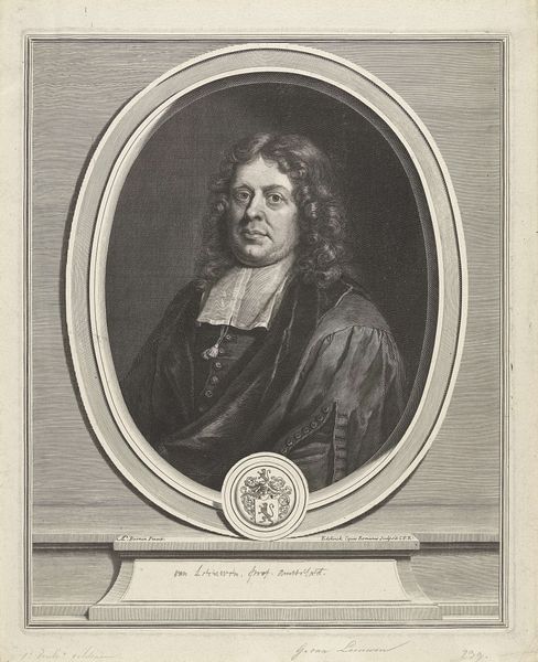 Curator: Look at this arresting portrait! We believe it to be an engraving of Gysbertus Oostrom, a reverend, and it likely dates to the late 17th century. Editor: My first impression? Intrigue mixed with a sense of formality. The dark tones and the subject's direct gaze certainly command attention. What stands out to you initially? Curator: I’m drawn to how the portrait operates as a symbol of authority during a period of intense social and religious upheaval in Europe. Think about the power structures at play. The church, as an institution, had immense influence over people’s lives, and this man was one of its gatekeepers. How does that contextual framework color your reading? Editor: It strengthens it, undoubtedly. Notice how the reverend is positioned. The partially opened curtain suggests both revelation and theatricality, framing him like a performer on a stage, ready to deliver his sermon, as he points outwards as if calling out the audience. Do you see any similar motifs in the piece? Curator: Absolutely, there’s an intentional performance of piety. Also consider the gaze directed straight at the viewer - a challenge? An invitation? And look at the books next to him. It represents established power and the tradition, but the single prop also represents patriarchy and elitism of knowledge. His position gives him agency to interpret this tradition to the public. Editor: And the engraving itself mimics the style that was in fashion then. Through rendering his curls, his robes, and the text with sharp detail, it memorializes Oostrom and reinforces his importance within the community. Do you think the piece fulfills its likely intention? Curator: For sure. Though it is just one snapshot from history, it tells us about so many broader themes still relevant now, which are: power, performance, social control, and resistance. We should examine that further, right? Editor: Without a doubt. Seeing how visual symbolism speaks across time reminds us that representation, then and now, plays a central role in our understanding of culture and ourselves.