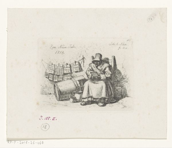 Egidius Linnig created this etching, "Damspelers," with a height of 88 mm and a width of 60 mm. The work presents an intimate, interior scene where figures are engrossed in a game of checkers. The composition is structured around the table, which acts as a focal point, drawing us into the players' concentrated world. Linnig's use of line is striking, creating depth and texture through cross-hatching and varying densities, which add to the almost palpable atmosphere. We can read signs in the players' posture and arrangement—the way they lean into the game suggesting a narrative of competition and camaraderie. The hatch marks forming the background create a feeling of enclosure, heightening the sense of a closed-off, private moment. Ultimately, the etching, through its formal elements, invites us to contemplate the subtleties of human interaction within the rigid structures of play and social space. It suggests that meaning isn’t fixed but emerges from how we engage with these structured environments.