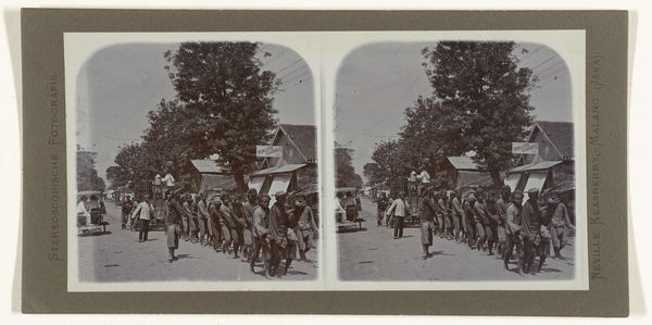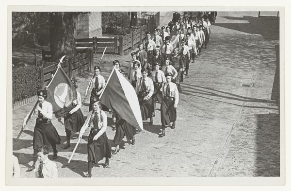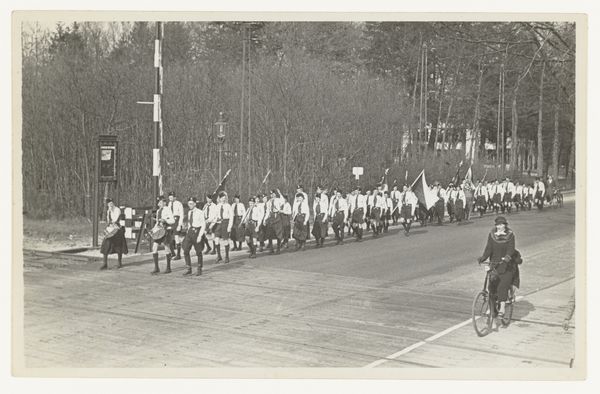 This photograph, "Duitse soldaten verlaten Nederland," or "German soldiers leaving the Netherlands," was taken by the Canadian Army Overseas. It’s a study in monochrome, various tones of grey, and the way light articulates texture. Look at the faces in the crowd. They’re all different, but together, they speak of a collective experience. The grays and blacks here aren't just colors; they're moods. A physical record of a moment, capturing the feeling of walking away. I can't help but think of the process of departure itself. It's a movement, a feeling, a story etched in shades. This photograph speaks to the way art captures and complicates history, inviting us to bring our own interpretations. It reminds me a bit of Gerhard Richter’s blurred photographs turned paintings, smudging reality and memory.