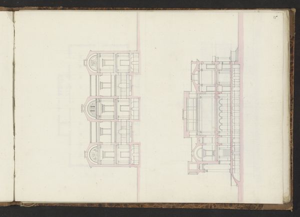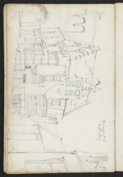 Curator: Here we have Cornelis Springer's "Gevels van Keizersgracht 133, 141 en 143," a cityscape study rendered circa 1846-1882 in pen and pencil. Editor: It's skeletal. All meticulous outlines but little substance, like an architect’s dream yet to be fleshed out by real life. Curator: These facades on the Keizersgracht, though rendered as an exercise, are also cultural symbols. Their careful rendering speaks to the values placed on architecture during the Dutch Golden Age—a visible manifestation of prosperity, civic pride and enduring values. Editor: Absolutely, the structural repetition—those neat rows of windows—echoes a kind of bourgeois striving for order and control. See how he marks and emphasizes different lines in different structures, inviting close comparison through material differences. Curator: Note also that, even within such rigid architectural structures, the artist includes minute individual flourishes on these structures, the cartouches above doorways. I wonder what stories might they suggest about their individual residents or civic identity? Editor: You see that incompleteness of one, the barest indication of fenestration, gives an insight into his method and suggests that Springer wanted us to understand it as more than a perfect mirror of urban regularity. The unfinished facade, then, serves as a reminder of the artist's deliberate, interpretive hand. Curator: I’m struck by the way Springer transforms mundane reality through detailed observation into symbolic architectural structures that carry so much cultural weight for the Netherlands. Editor: And for me, it's precisely the artist's calculated and selective omissions and elaborations in his technique, laying bare both the structure of the building and the structure of representation itself, that invites close contemplation.