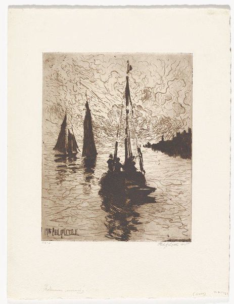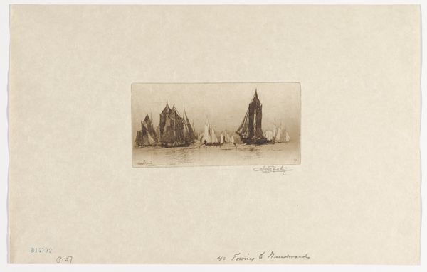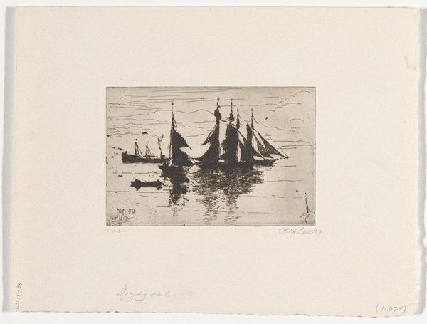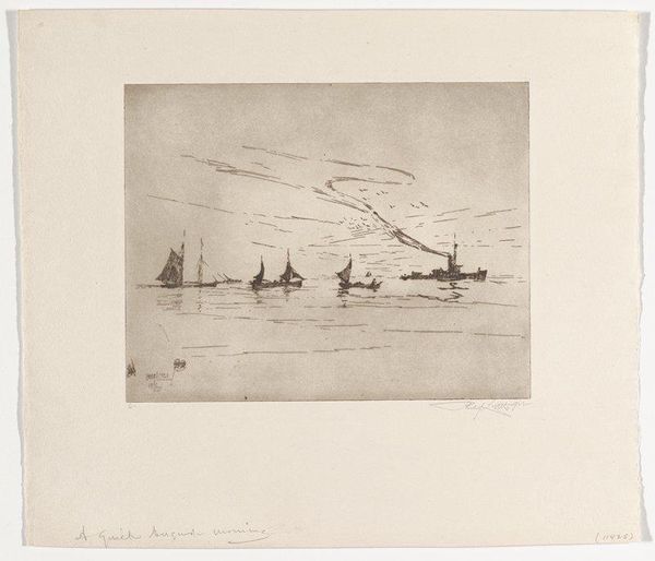 Editor: So this is "Coasters," an etching made by Philip Little in 1915. It feels really tranquil, almost meditative, watching those sailboats just sitting on the water. How do you interpret this work? Curator: It's evocative, isn't it? Considering its historical context – 1915, in the thick of the first World War – this image offers an interesting counterpoint to the dominant narratives of the time. Editor: A counterpoint? How so? Curator: Think about it: while Europe was engulfed in conflict, Little depicts a scene of almost idyllic stillness. This contrast begs questions about the role of art during wartime. Is it escapism? A form of quiet resistance? Or a commentary on the stark differences in lived experience based on geography and social positioning? The coasters, these working boats, also invite reflection. Who were these boats for? What purposes did they serve? How did industrial changes on the sea change or reinforce the dominant social order? Editor: I hadn’t thought about it in terms of war or class dynamics. Curator: Exactly. And the etching technique itself adds another layer. The fine lines, the delicate rendering of light on the water, speaks to a certain nostalgia. A yearning for simpler times, perhaps? Editor: So you're saying the peace in the picture becomes more loaded knowing the world outside the picture? Curator: Precisely. It’s a reminder that even moments of apparent serenity are shaped by broader socio-political currents, reflecting varying perspectives of class, power, and historical moment. Editor: Wow, I will never look at a peaceful seascape the same way. It gives you so much to think about. Curator: That’s the power of art: not just to show us beauty, but to make us question the very nature of beauty itself, within historical and cultural contexts.