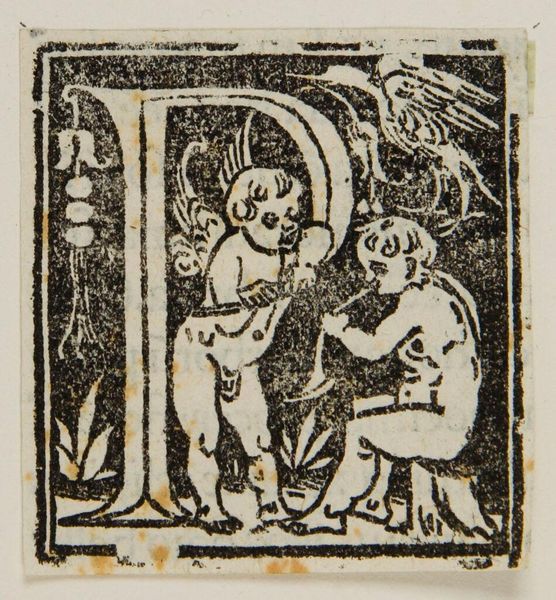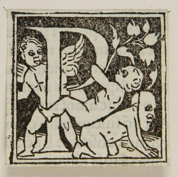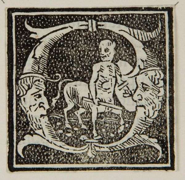 Editor: This is "Initial C," by an anonymous artist, its date is unknown. It looks like a woodcut or engraving. What do you see in this piece? Curator: Notice the dominance of line and the stark contrast of black and white. The composition, constrained within the letterform, utilizes the figures to create dynamic tension. Semiotically, consider what the absence of color implies. Editor: So the meaning isn't just in the narrative scene, but in the way it's presented? Curator: Precisely. The formal elements are not merely a vehicle for content but constitute the content itself. The balance, the contrast, and the negative space all speak. What does this tell you? Editor: It’s fascinating how much information is conveyed through such a limited palette. Thanks for pointing that out!