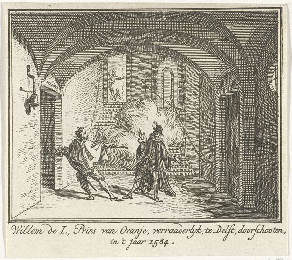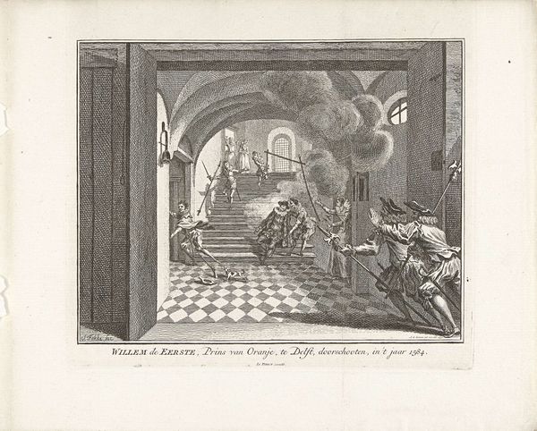 Editor: Here we have Simon Fokke’s engraving, “The Murder of William of Orange, 1584,” made between 1782 and 1784. The stark monochrome really amplifies the drama of the moment, doesn’t it? I can almost hear the gunshots. What historical weight do you think this image carries? Curator: It’s not just a historical record; it's a piece deeply embedded in the political narratives of the Dutch Republic. Fokke created this image centuries after the event, during a period of nation-building and heightened political consciousness. Think about the choice to depict the assassination in such stark terms. How might that image function in the context of rising nationalism? Editor: That’s interesting. I hadn't considered the timing so closely. So, it’s less about accurately representing the past and more about shaping the present? Curator: Precisely! And more than that, the emphasis on violence raises some crucial questions. Who benefits from visually sensationalising such an act? How might the engraving promote certain ideas about resistance and martyrdom? This image, viewed critically, can provide insight into the power dynamics of the era and ongoing identity constructions of the nation. It’s an interpretation, not simply a document. Editor: That makes so much sense. So, by understanding the sociopolitical conditions when Fokke created the work, we see this isn’t just a depiction of a historical event; it’s a politically charged statement. Curator: Exactly! It allows us to unpack the complex relationship between art, memory, and the construction of national identity, as it connects the Dutch struggle for independence to debates around governance, representation and justice across time.