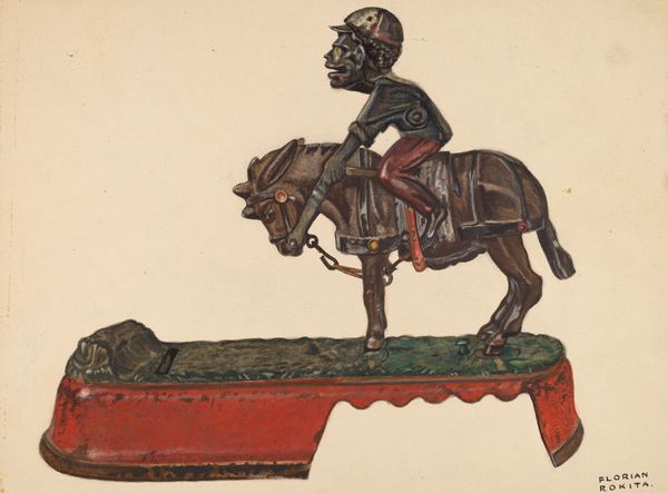 Chris Makrenos made this painting of a ‘Toy Bank: Figure with Mule’ on paper, but the date is unknown. The ochre and burnt sienna tones give a sense of warmth and nostalgia to the piece, don't they? It’s got this real homemade feel to it, like a Sunday painter having a crack at their favourite toy. The toy itself looks like it has been cast from solid metal. It’s a funny old thing, a bit grotesque, and probably quite fun to play with. See the way the artist hasn’t laboured over the surface? It’s all a bit slap-dash, loose, and that’s what I like about it. The underpainting is visible in places, and the colours are laid down in simple blocks. The red base of the toy is outlined in black, with thin white lines to suggest highlights. It almost looks like a woodcut. The shadows under the mule’s belly are smudged and smeared. You can almost feel the artist’s hand moving across the paper. It reminds me a little of Milton Avery’s simplified forms and muted palette. This piece embraces ambiguity and multiple interpretations over fixed meanings, so let your imagination run wild.