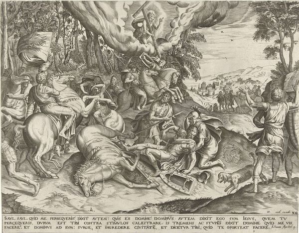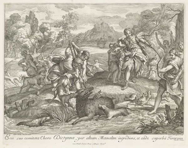 Curator: This dynamic engraving, "Deer Hunt," is by Adriaen Collaert, who lived from 1560 to 1618. It’s part of the Harvard Art Museums collection, and the plate measures about 8 by 12 inches. Editor: My first thought? It feels like controlled chaos—a flurry of legs and antlers, all meticulously etched. A lot of very anxious energy emanating from this small plate. Curator: Absolutely. Collaert captures the drama of the hunt. Notice how the dogs converge on the deer, a symbol of vulnerability and pursuit? Editor: Yes, and the hunters on horseback seem almost indifferent to the carnage, their faces impassive. It's like they're participating in a ritual rather than a chase. I also wonder about the Latin verses... Curator: The verses below amplify the feeling of the scene. The deer exhausts easily with the javelin. With the canines the hunter follows the anxious. A lot of visual and psychological tension. Editor: It’s strangely compelling. So much detail packed into such a small space—it really pulls you in. Curator: It does make you think about the cycle of life and death, doesn't it? A rather intense scene captured with such exquisite skill.