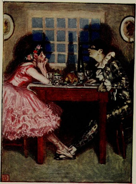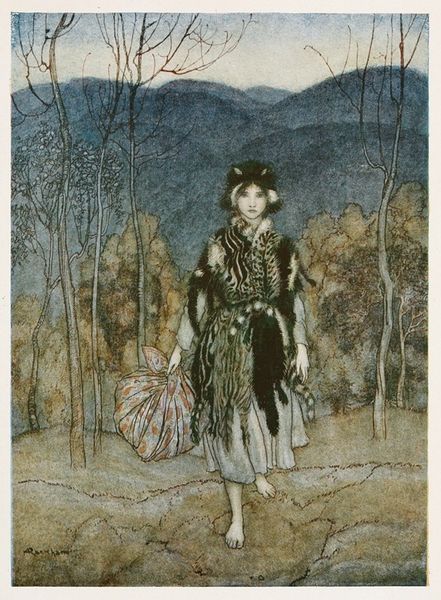 Curator: Here we have a watercolour illustration by Arthur Rackham, titled "Tristan." Editor: The colors feel muted, yet rich at the same time. I'm struck by the theatricality of the scene, like a moment plucked right out of a play. There is such attention to detailing all the people in their garments Curator: Absolutely, Rackham's craft is key. His application of watercolor allows for a fluidity, a delicate layering of washes that gives the piece both depth and a somewhat ethereal quality. And observe how he uses line work, almost etching-like, to define form. Editor: The choice to depict Tristan in such a specific setting really interests me. He is posed singing, his harp clutched, at what appears to be a royal feast? What kind of symbols or archetypes do we think are most on display here? Curator: We have figuration reminiscent of a Medieval tapestry or manuscript. There is great use of light, that defines this moment during dinner as a medieval play-act, that is made accessible in modern fantasy-art through the artist's application of materials Editor: And isn’t it fascinating to consider how those elements -the king, the feast, the performer- evoke very particular themes and motifs that have carried weight through centuries of cultural imagination? This image, for me, taps into something very primal and familiar in the psyche. Curator: Precisely. The means and setting certainly work together. To your point on primal archetypes, that dog is giving all its focus to the singer, almost with reverence. Perhaps Rackham highlights, on top of Tristan's musicianship, the material comfort afforded by this medieval tableau of class. Editor: A compelling perspective. I came in drawn to the mood and narrative possibilities, but focusing in on those constructed elements helps appreciate this tableau's depth of connection to storytelling. Curator: And that deeper connection back to materiality adds an extra, equally important dimension to the viewing experience. Editor: Indeed. A potent intersection of form and idea to consider here.