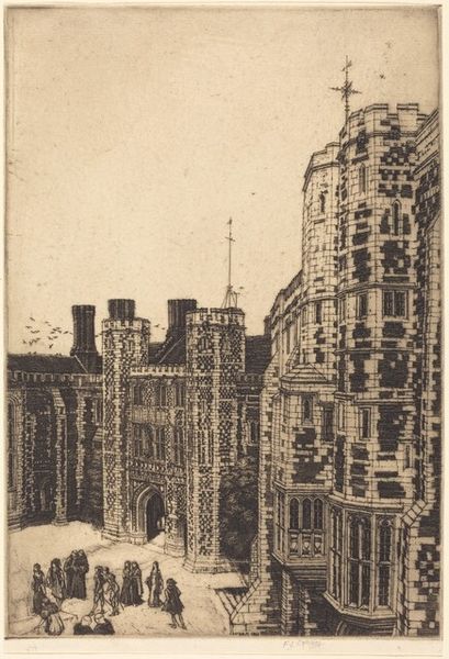 Joseph Pennell made this drypoint etching, "Old Court," in 1906. The image depicts one of the Inns of Court in London, specifically Lincoln's Inn. Pennell was an American expatriate artist living in London at the time, drawn to the city's rich history and architectural grandeur. This image, with its intricate details and dramatic contrasts of light and shadow, evokes the atmosphere of a centuries-old institution steeped in tradition. These Inns were and remain central to the organization of the English legal profession. They represent a closed, hierarchical social world and a powerful elite. What makes this image interesting is how it portrays the Inns of Court. Is it a celebration of British tradition, or a subtle critique of its exclusivity? To answer this question, we can look at the art market and critical reception of Pennell's work in early 20th century Britain. Through this kind of research, we can better understand the complex social dynamics reflected in this seemingly straightforward architectural study.