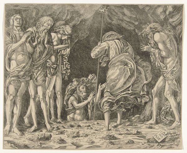 Curator: I’m struck by the density of this charcoal drawing. The compressed figures practically emerge from the murky background. Editor: This is Théodore Géricault's, "The murderers carry the body of Fualdes," created around 1818. It depicts a grim historical event. It is currently held at the Musée des Beaux-Arts de Rouen. Curator: The application of charcoal creates such drama! Notice the sharp contrasts – the almost bleached white of the body against the smudged, intense darkness enveloping the figures. The physical act of rubbing the charcoal seems viscerally connected to the violent act depicted. The tangible remains mirror a tragic event through sheer materiality. Editor: Absolutely. Géricault wasn't just creating a depiction; he was actively participating in a cultural and political narrative. The murder of Fualdès was a sensational scandal. The artist leverages this through his drawing by producing it when the clamor was the loudest to be consumed for years and even decades to come. His work served a public role. It served a morbid fascination for an event with many political intrigues. Curator: I agree. And the medium itself enhances this sense of morbid intrigue. Imagine the availability of materials and Géricault's choice to wield them so effectively in translating a scandal through charcoal, a comparatively "base" material instead of refined oil paints, perhaps reflecting the grittiness of the crime itself and challenging social hierarchies associated with materials in art production. Editor: True. The scandal provided endless interpretive narratives. We can note here how images help frame our collective memory of events. Géricault clearly understands the power dynamics at play. By choosing this subject, he puts himself in the midst of a complex and contested social moment, actively molding his art in order to feed political narratives of the time. Curator: Looking at the process involved really opens up my appreciation for this work, especially how the choice of the materiality of drawing materials accentuates its impact. Editor: Precisely, understanding the work’s historical context and socio-political motivations reveals why it is remembered today and its historical significance.