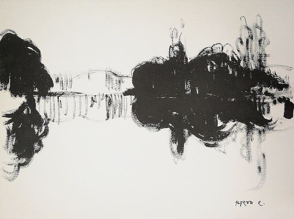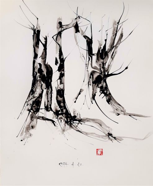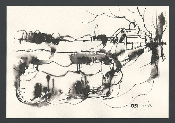 Curator: We are looking at Alfred Freddy Krupa's "The Art Pavilion in Zagreb," created in 2016 using ink on paper. It’s a fascinating piece demonstrating a bold gestural technique. What's your immediate reaction? Editor: A flurry! Like a memory struggling to surface through a tangle of branches, all rendered in dramatic, dark ink. The negative space almost feels as substantial as the forms themselves. Curator: Precisely. The stark contrast accentuates the linear quality, where each stroke conveys a dynamic sense of immediacy and energy, constructing the composition of the cityscape through carefully placed marks, the balance of positive and negative space directs our gaze to the architectural forms. Editor: It does have a lovely rhythm. I almost feel like I'm glimpsing the Pavilion through a storm or a fever dream. It's quite evocative. The stark black against the white is incredibly bold. It speaks of something deeply felt, rendered with astonishing swiftness. I find my eyes keep darting from detail to detail, yet pulled to the center as the inky lines direct them to the pavillion. Curator: One could also analyse how Krupa employs the technique of Sumi-e painting. The use of ink wash painting can be regarded as both traditional and avant-garde through semiotic strategies to deliver unique experience, even from distance. How would you respond? Editor: Well, considering that ink wash painting evokes mindfulness, yet with an abstract sensibility, it allows for freedom and playfulness. A feeling which reminds me to allow art be alive, beyond fixed notions, as if the landscape breathed right into life. Curator: I appreciate how your emotional intuition captures this particular moment in Zagreb. It's gestural and highly charged, which enables a close reading and invites further explorations for the audience. Editor: And thank you for shining your knowledge by reminding the rigor in technique. Ultimately, it speaks of the simple beauty of capturing a place in time with an accessible, everyday medium like ink.