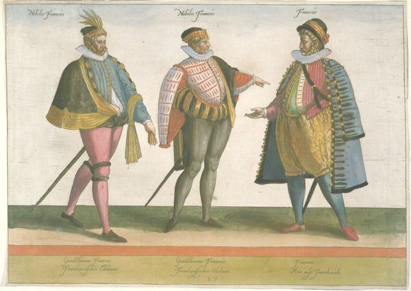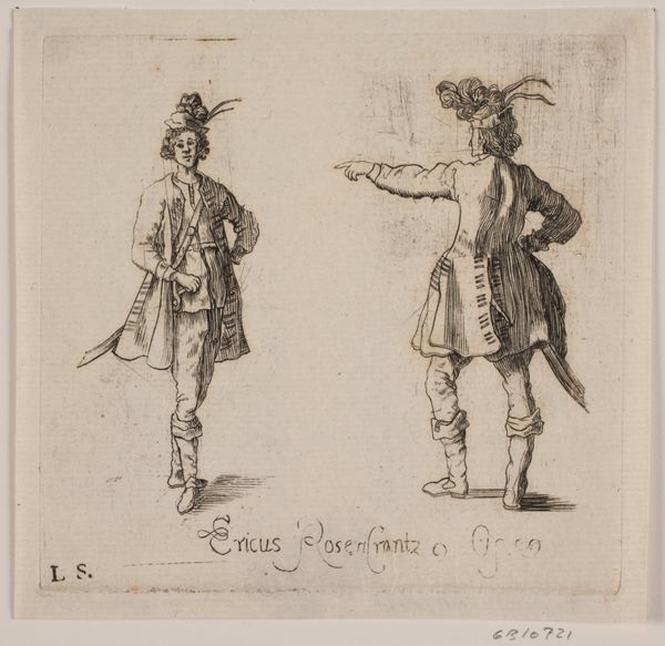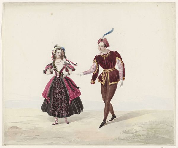 Huib van Hove Bz. created "Two Men in Historical Costume" in 1841 with pen and watercolor. At first glance, the painting presents two figures in elaborate costumes against a stark white background, their forms meticulously detailed. The artist’s choice of watercolor lends a certain softness to the attire, yet the structure remains crisp. The figure on the left sports a flamboyant purple and gold ensemble, the texture of his velvet trousers almost palpable. His counterpart is clad in deep green, with accents of crimson and a feathered hat. Van Hove's work can be interpreted through the lens of semiotics. The attire serves as a signifier of status and identity, drawing from historical codes to construct a visual narrative. This approach allows the painting to engage with ideas of representation and the construction of meaning through sartorial choices, challenging the viewer to decode the message embedded within each carefully rendered detail. The texture and layering, made possible by the watercolor medium, is not just aesthetic but functions as part of a larger discourse on historical representation.