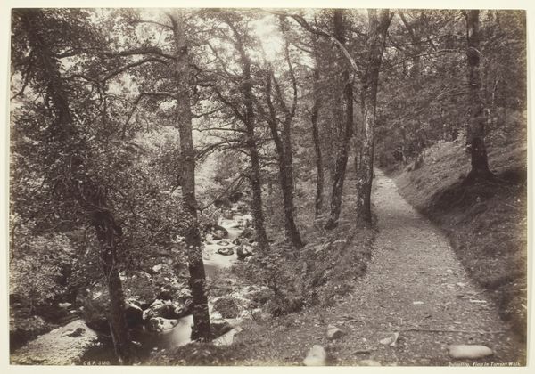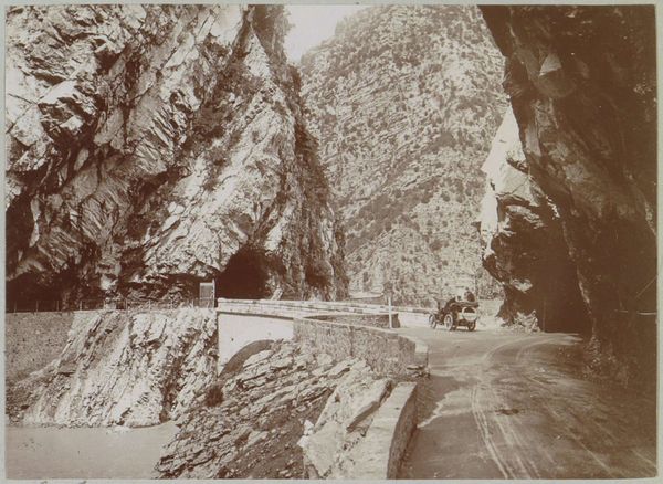 Editor: Here we have "Weg en rivier in een kloof van de Gorges du Cians in de Alpes-Maritimes," a 1903 photograph from the Rijksmuseum. Looking at it, I immediately feel this immense, almost humbling sense of nature's scale. What's your take? Curator: Well, I'm transported! It reminds me of when I drove through the Rockies, utterly dwarfed by these ancient stone giants. Here, Delizy captures not just a landscape but a palpable sense of geologic time. Notice how the road and the river, human elements, are relegated to these thin strips at the bottom of the frame. Editor: So, a bit of a statement on humanity’s place, or lack thereof, in the grand scheme? Curator: Exactly! And think about photography itself. What could feel more real, yet the photographer’s vision is always filtered, selecting and shaping the very thing that claims to be "objective". Do you get the sense he's framing the road and river not so much for the beauty but more like remnants after a big earthquake. Editor: I do now, especially thinking about how our experience of that space is still mediated. Looking at it, I initially assumed there was only photography; is there manipulation with paint on the image too? Curator: Hmmm, now that you point that out it is indeed something I didn't note initially but seems right as well. Think also about what has been included, and more importantly, omitted from our vision! What do you think the photographer wanted us to experience with those choices? Editor: I guess I hadn't considered it that way. It seems I was very eager to apply my prior assumptions when trying to approach it as objective! Curator: Beautifully put! Art – even documentary art – always sneaks a little subjectivity in, doesn't it? Editor: It certainly does. Thanks; I see the piece in a completely different light now. Curator: My pleasure! A reminder that engaging with art is less about answers and more about cultivating richer questions.