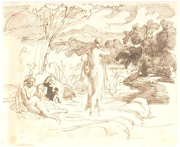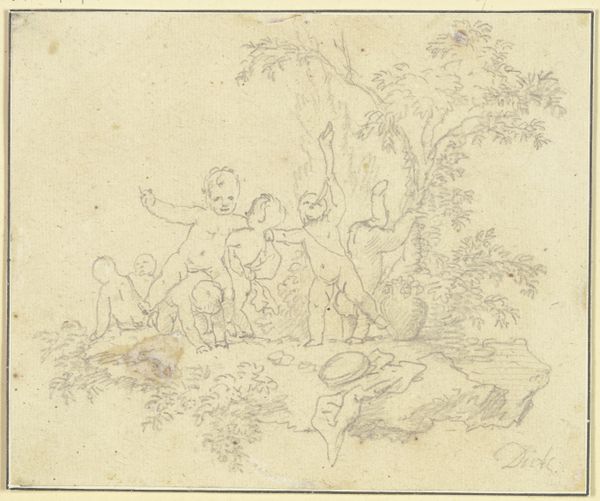 Editor: This is "Mercurius en Argus," a pen and ink drawing done sometime between 1741 and 1803 by Cornelis Brouwer, housed here at the Rijksmuseum. The detail is just incredible for such a small piece! What immediately strikes me is the contrast between the human figures and the almost cartoonish rendering of the animals. What are your thoughts? Curator: The social function of this drawing intrigues me. Given Brouwer's position and the art market of the time, this likely wasn't conceived as a high art object for public display, but rather a demonstration of skill or perhaps even preparatory work for something larger. Why choose this mythological scene? Editor: Good point! I guess I assumed a classical story elevated the drawing, but you’re suggesting its purpose changes our perception. Is it less about the *narrative* and more about Brouwer’s capabilities as an artist? Curator: Precisely! Consider the Baroque style trending towards detailed naturalism, even within mythological subjects. The "academic art" tag points to the artist displaying his proficiency, almost as advertisement or practice. Does it successfully negotiate that line between artistry and mere demonstration, in your view? Editor: I can see your point. Knowing its social context as a display of technique certainly changes how I view it. The somewhat stiff poses of the figures, previously a distraction, now seem purposeful—demonstrating his skill in rendering the human form. Curator: It reveals much, doesn't it? Considering the artistic infrastructure and social milieu drastically alters our perception and valuation of a work like this. Editor: It absolutely does! I came in thinking "mythological landscape," but now I'm leaving thinking about Brouwer's place in the art world and how drawings like this might have helped him navigate it. Thanks!