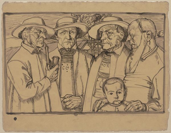 Editor: This graphite drawing, "XXVste Nederlandsche Taal- en Letterkundig Congres," made in 1899, presents a rather unflattering gathering. Everyone looks rather… grumpy? The caricatures are quite exaggerated! How do you interpret this work? Curator: Well, as a historian, I immediately consider the social context. These are likely participants of the 25th Dutch Language and Literature Congress. The caricatured style and rather stern expressions raise some interesting questions about how the artist perceived this group. Are we meant to admire them, or is there a critique embedded here? Editor: It's hard to say for sure. The mugs on the table suggest a convivial gathering, but the overall feeling is anything but! Do you think the artist might be commenting on the seriousness, perhaps even stuffiness, of the academic world? Curator: Exactly! Consider the period - the late 19th century was a time of shifting social and political landscapes. The emerging role of academics and intellectuals was under scrutiny. Perhaps this drawing offers a satirical take on the self-importance of such figures. We also should explore where it was displayed. Was this image meant for private amusement, or public consumption? This informs how we understand its purpose and impact. Editor: So the drawing might not just be a portrait of these men, but a commentary on their role in society? Curator: Precisely. It prompts us to consider the public role of intellectuals and the politics of representation. The artist isn't merely recording a scene, but actively shaping a narrative about this specific group within a particular historical moment. Editor: That really changes how I see it. It’s not just grumpy scholars at a meeting, it's a statement about power and perception. Curator: It shows the power of art to shape public opinion, even in a seemingly simple drawing. We are also made to understand the role and expectations related to the subject that’s being drawn. Editor: Thanks for opening my eyes to this context! It’s a lot more interesting than I initially thought.