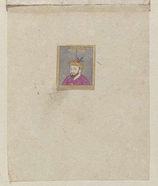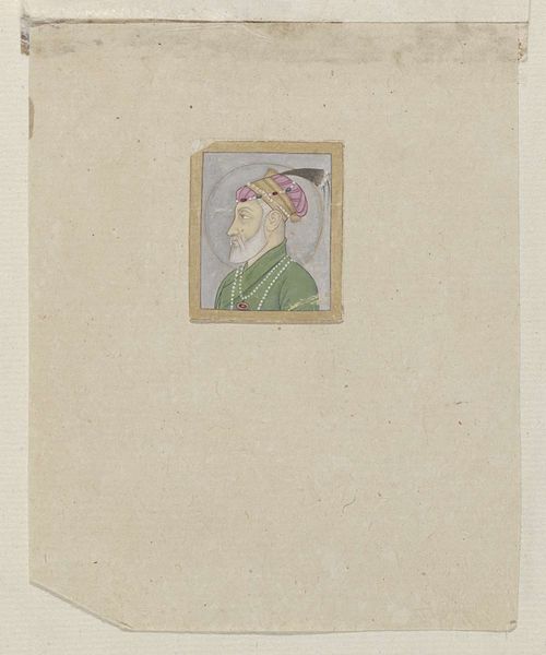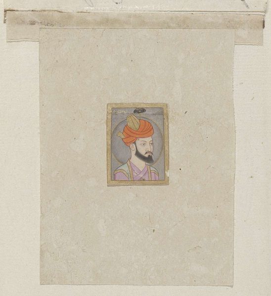 Editor: Here we have “Den groten Auneng Zub,” a miniature watercolor portrait from around 1675 to 1755, attributed to Adrianus Canter Visscher. The detail is astonishing, given its size. There's something so serene and knowing about the subject's expression. What strikes you when you look at this piece? Curator: It’s like gazing into a captured moment of tranquility, isn't it? What I find fascinating is the melding of cultural aesthetics. Visscher, though a Dutch name, created something that sings with the flavors of Asian art. Look at that soft halo and the deliberate pose. It whispers of spirituality, perhaps a leader or a sage in contemplation. Tell me, what do you think that gesture of his hand suggests? Editor: It feels like a welcoming gesture, almost an offering. Or perhaps he's bestowing a blessing? Curator: Precisely! It invites introspection. The artist almost lures us into this quiet realm, doesn’t he? Do you notice how the muted color palette contributes to that feeling? There is such softness about it. I am just really enamored by its serenity. It suggests wisdom tempered by years. Don’t you find that captivating? Editor: Absolutely. I was so focused on the details, I missed the subtle cultural blending and overall meditative quality. Curator: Art, especially the miniature, always asks you to slow down, to truly see. Each stroke, each shade... they're little doors into another world, wouldn't you agree? Editor: I never thought a small painting could be so expansive. Thank you, this has changed how I see it entirely!