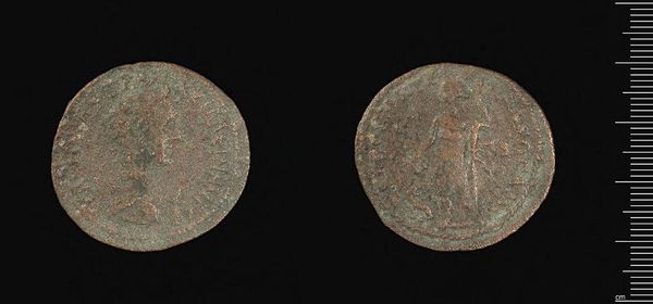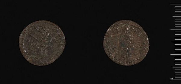 Curator: This is a coin minted in Perge under the reign of Gallienus. It's part of the Harvard Art Museums collection. Editor: Immediately, I'm struck by the patina of age, the way the metal has transformed, whispering stories of centuries buried. Curator: Absolutely. The coin, though small, reflects Gallienus' efforts to legitimize his rule through widespread distribution of his image. These weren't just about commerce, they were propaganda. Editor: And what a potent symbol a portrait is – the deified ruler promising stability. What do you make of the markings on the reverse? Curator: My read is that it's a temple dedicated to Artemis. The cult of Artemis Pergaia was extremely powerful and this would have been an important local reference. Editor: Fascinating. It's a reminder that even in something as seemingly simple as a coin, layers of political and religious power dynamics are embedded. Curator: Indeed. It offers a glimpse into a very specific moment in the Roman Empire's relationship with its provinces. Editor: It's humbling to consider the sheer volume of human touch this object has seen, the economies it has fueled.