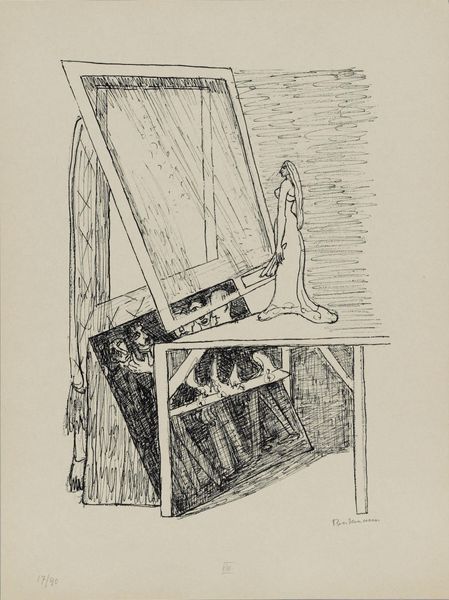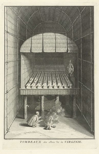 Curator: It's difficult to look at this etching, "Visit to a Farm—The Roost" by Charles Jacque without noting the density of lines used to construct the scene. What’s your first impression of its pictorial space? Editor: It feels claustrophobic, almost suffocating. The etching creates a very tight, cramped space filled with repetitive diagonal lines, but it's mostly monochrome which makes it easier on the eye than if this amount of lines was reproduced in color. There isn't any sense of air or depth. Curator: I agree. Consider the period: mid-19th century France. Jacque, as part of the Barbizon school, aimed to depict rural life authentically. This print, published in "Le Magasin Pittoresque," offered an urban audience a glimpse into a farmer's existence. Editor: Yes, it's interesting to think about the intended audience. I see the visual compression now less as an aesthetic choice and more as a way to convey the, perhaps, unglamorous realities of agricultural life. But I wonder why so many chickens and such tight, structured linearity. Curator: Chickens symbolize domesticity, and perhaps this work offers a commentary on societal structures and rural labor practices. Etchings like this made art accessible, playing a role in shaping perceptions of country life. Did they succeed or reproduce cliches? Editor: The ladders and the perches certainly dictate the chicken’s positions—the eye travels up the work, which provides an underlying structure that feels orderly amidst the visual chaos. The almost clinical arrangement removes all chaos though. Is this really the “naturalistic” work the Barbizon school was aiming to create? It’s intriguing! Curator: Charles Jacque contributed to the broader social narrative surrounding rural France and agricultural reforms through these genre paintings of rural life. It raises important questions about the role of imagery and public imagination during the era of mass publications. Editor: I find my initial discomfort somewhat mitigated by the understanding that there may be more than meets the eye in Charles Jacque's "Visit to a Farm," so that's interesting. It's now a visual narrative rich with layers of socio-historical context!