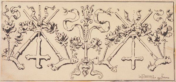 Joseph Pennell made this ink on paper drawing, Tail Piece from Michaelangelo's Faun, likely at the turn of the 20th century. Pennell, though American, spent much of his career in London, where he was part of a circle that promoted printmaking as a fine art. Here, the evenness of the lines and careful rendering speak to the reproductive nature of this medium. Though unique, this drawing was likely made to be translated into a lithograph, etching, or other printed format. Pennell was deeply invested in this process, seeing it as a way to democratize art, taking imagery originally made by hand and disseminating it widely. The composition itself speaks to this intention. The strong symmetrical arrangement, combined with allegorical details, such as crossed staffs and floral motifs, suggests that it might have been used as an emblem or cartouche for an arts publication. Ultimately, the meaning of this artwork lies in its making, a fascinating intersection of craft, design, and social context.