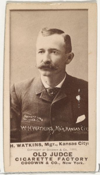 Editor: This is an albumen print from 1887, titled "William Henry 'Wattie' Watkins, Manager, Detroit Wolverines" from the Old Judge series for Old Judge Cigarettes, produced by Goodwin & Company. The sepia tone gives it such an antique feel; what really strikes me is how posed and serious it is for a baseball card. What do you see in this portrait? Curator: I see a fascinating intersection of celebrity, commerce, and the burgeoning power of visual media. Consider the context. Watkins, a manager, not even a player, achieving this level of visibility speaks volumes. Baseball was solidifying its place in American culture. But it is 'Old Judge Cigarettes' that captured the essence of their cultural era by including athletes’ photos on collectable cards. Editor: So, you are suggesting the baseball manager’s image has become inextricably bound to consumer culture? Curator: Exactly. What cultural aspirations were tied to these symbols? How were cigarettes culturally significant in the late 19th century? Smoking was seen as suave and cultured at this time and, linking that identity with baseball elevated baseball further. Now what are your impressions of how he looks and poses in that portrait? Editor: Well, his direct gaze is striking and exudes confidence. It makes me think about how carefully constructed public image was even back then. I find the contrast with the informality we see in sports photography today quite compelling. Curator: Indeed. Even a "simple" baseball card holds layers of social and cultural significance, speaking volumes about memory and how industries shape our cultural values. Editor: I hadn't thought about it that way, this puts the picture in a totally new perspective. I’ve certainly gained a richer understanding of the portrait as more than just a simple card now.