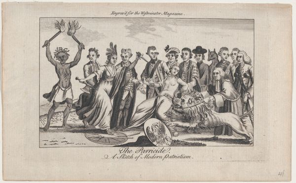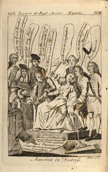 Curator: This engraving, titled "The Able Doctor," by Paul Revere, dates to 1774 and appeared in the "Royal American Magazine." What strikes you about it initially? Editor: The imagery is certainly visceral. You have this allegorical figure of America being forcibly fed something, while figures that I presume represent the British leadership look on with varying degrees of concern or outright malicious glee. The whole composition speaks of forced subjugation. Curator: Indeed. This is a piece steeped in political commentary. We see America personified as an Indigenous woman being held down while Lord North forces tea down her throat – a not-so-subtle reference to the Tea Act and the events leading up to the Boston Tea Party. Editor: And it’s particularly unsettling how she's depicted as vulnerable and almost infantilized, doesn't it? I can see the imperialistic mindset at play. She's not a partner in trade; she's property to be controlled. It draws upon much older ideas of feminine allegories needing to be tamed and guided. It says a lot about who has power and how it is deployed. Curator: Note also the presence of Britannia, who averts her gaze, seemingly in distress at the scene unfolding. Revere positions her as either unwilling or unable to stop the forceful actions of the British ministry. The document being brandished in the scene is “Boston Port Bill.” The smoke billowing around the scene reminds us that "Boston is cannonaded". Editor: The visual rhetoric here is so charged. It casts the British ministry as aggressors violating a vulnerable America. It attempts to incite fury in an attempt to unite people toward change, though this imagery can only really engage if viewers are given access to understanding these events as shared and real. Curator: Consider how effectively Revere leverages this emotional impact. This isn't merely a historical record but a call to arms, carefully crafted for public consumption. A lot was at stake and this artwork, mass produced and distributed, had an important role in creating what we can now consider American national consciousness. Editor: Definitely. Looking at the work from our contemporary vantage point, it allows us to consider these themes and narratives about colonial subjugation. Even the caricature serves the specific function of painting these players into "bad guys", solidifying identities and positions. Curator: A potent reminder of art’s enduring ability to shape public opinion, rooted as it is in the political currents of its time. Editor: Yes, "The Able Doctor" showcases a colonial perspective, with layers of narrative for modern analysis through theory.