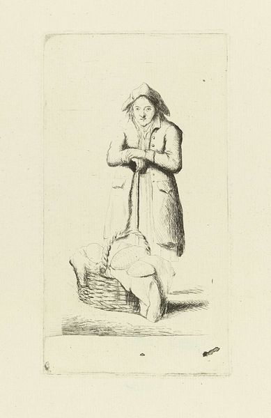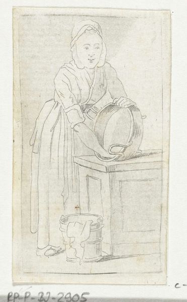 Anthonie van den Bos created this print, "Dienstmeid", likely in the late 18th or early 19th century. The composition centres on a maidservant, depicted through delicate lines that define her form and the surrounding domestic space. Notice the interplay of light and shadow; it subtly models the figures and objects, adding depth to the scene, while also contributing to the overall mood. The artist uses the formal device of contrasting textures to differentiate between the smooth metal of the bucket and the soft fabric of the maid's dress. This print offers a glimpse into the daily life of a working woman, but it also engages with broader themes of labour, domesticity, and representation. The semiotic elements—the bucket, the simple clothing—function as signs that construct a narrative about social class and gender roles in the artist’s time. How might we interpret this image as a commentary on the structures of everyday life?
