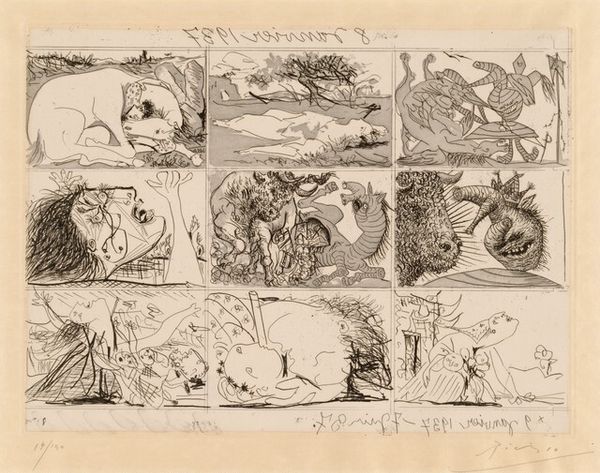 Curator: This is "Odd Fish" by George Cruikshank. This engraving presents a series of vignettes, each exploring fantastical aquatic themes. Editor: It's wild! Like a fever dream of maritime puns. It’s also surprisingly charming, in its own quirky way. Curator: Note the composition: discrete scenes framed within the larger sheet. Consider, too, the texture, the delicate lines creating depth and form. Cruikshank uses these techniques to build visual interest. Editor: The sheer inventiveness of these scenes is delightful! They are all about oddness, aren't they? It is like he cast the net of his imagination and pulled up the weirdest catch imaginable. Curator: Indeed, this work exemplifies Cruikshank's satirical approach, using humor and the grotesque to comment on society. Editor: Totally. This feels like a reminder not to take ourselves too seriously, a call to embrace the absurdity of life, served up with a wink and a splash.
